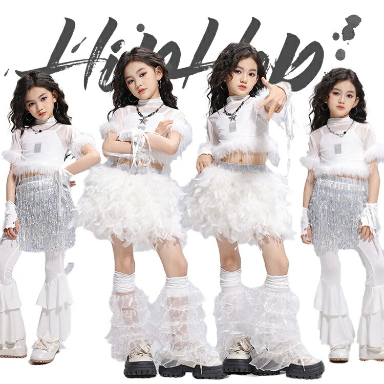 キッズダンス ダンス衣装 フェザー 白 セットアップ 女の子 ホワイト スパンコール チュールスカート シャツ へそ出し 可愛い ガールズ ダンスウェア 団体服 発表会 レッグウォーマー