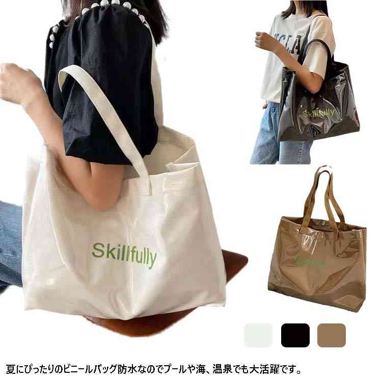 レディース プールバッグ クリア素材 大容量 キャンバス素材 トートバッグ ビーチバッグ 鞄 ビニールバッグ 海水浴 レジャー 大きめ カバン