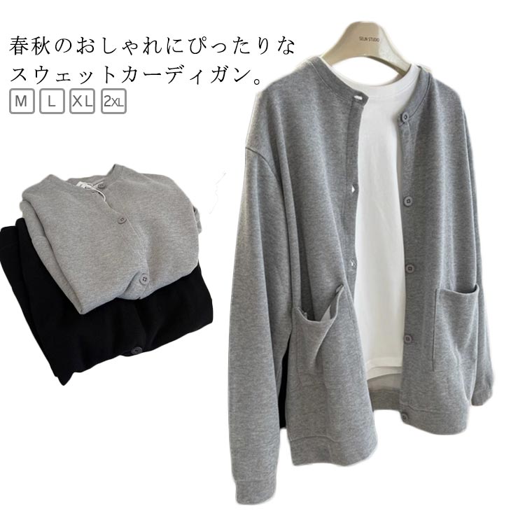送料無料 カーディガン スエット レディース トップス カーデ 羽織り 長袖 丸首 ライトアウター 前開き 薄手 ノーカラー ジャケット 学生