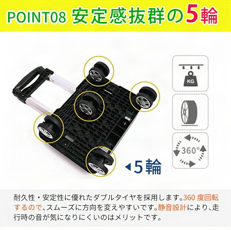【安定感抜群の5輪】耐久性・安定性に優れたダブルタイヤを採用します。360度回転するので、スムーズに方向を変えやすいです。静音設計により、走行時の音が気になりにくいのはメリットです。抜群の安定力と走行性を発揮してくれるし、凸凹な地面でもスムーズに動きます。5輪ショッピングカートはより安全です。操作が簡単で、軽く押して回転させます。