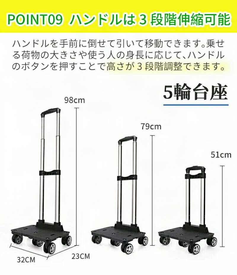 【ハンドルは3段階伸縮可能】ハンドルを手前に倒せて引いて移動できます。乗せる荷物の大きさや使う人の身長に応じて、ハンドルのボタンを押すことで高さが3段階調整できます。