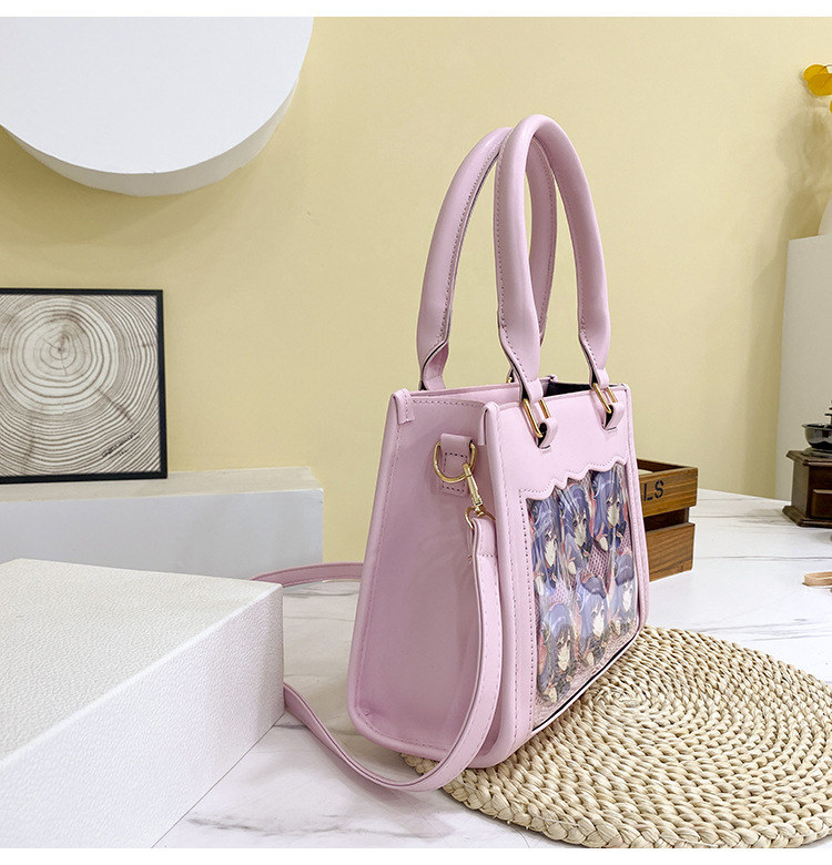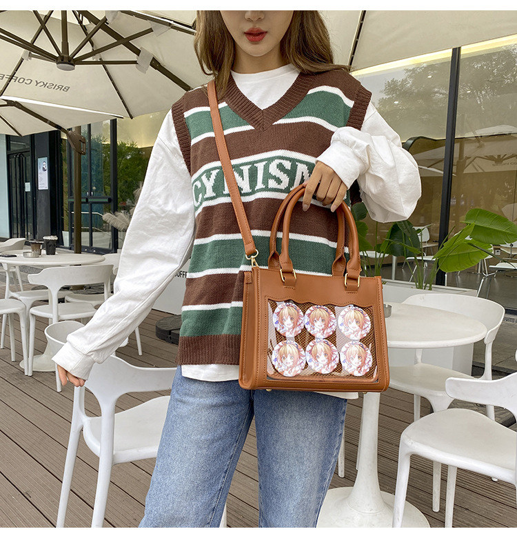 前の透明カバーに飾り板が入っていて、自分の好きな小物を入れることができるバッグです。 好きな芸能人や、アニメの写真 、缶バッジ、ストラップ、キーホルダーなどを入れるだけで、簡単に世界で1つたったのオリジナルバッグの完成です、毎日楽しく使える。