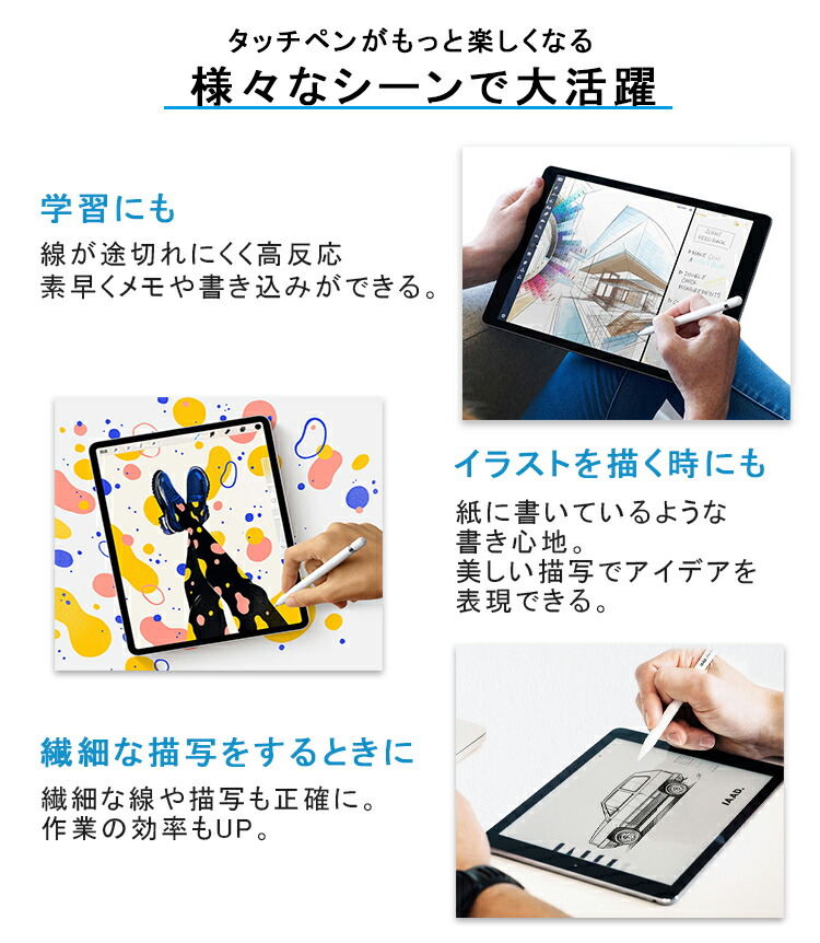 Apple Pencilなどのタッチペンでメモを書いたりお絵描きしたりするのに最適。書き心地がより一層良くなる。タッチペン派には必須のアイテム!