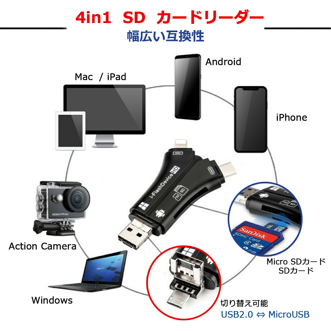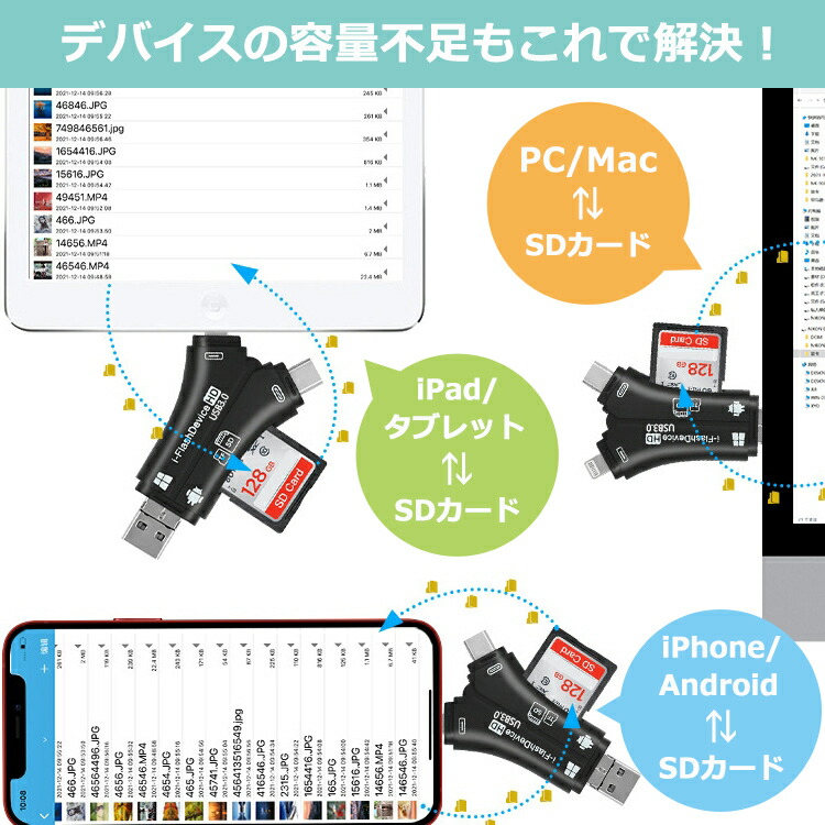 スマホ SDカードリーダー iPhone microSD マイクロSD カードリーダー 携帯 スマホ 写真 カメラ iPhone USB USBメモリ 32GB 64GB 128GB 256GB 512GB 1TB メモリー スティック アルバム 保存 ファイル データ 移行 移動 転送 高速 整理 バックアップ コピー ストレージ デバイス フォーマット 対応容量 大容量 最大容量 Android アンドロイド USB-C タイプC Type-C ハブ 一眼レフ マルチカードリーダー SDカードカメラリーダー 外付け メモリーカード lightning ライトニング Apple アップル マックブック MacBook air pro アイフォン アイパッド iPad iOS 15.3.1 ワイファイ 不要 ワイヤレス 書き込み 書き込み禁止 ロック 録音 音声 撮影 録画 動画 読み込み 2枚 3枚 高速 速さ 高性能 耐久性 最新 使い方 抜き差し 口コミ 信頼性 ランキング 性能 便利 プレゼント ギフト おすすめ ケーブル sim フリー ケース カバー Surface サーフェス ノートパソコン win10 カーナビ ドラレコ ブルーレイレコーダー テレビ プリンター フォトブック キッズカメラ TF変換アダプタ OTG機能 SD/TF/USB3.0カードと互換性 相互転送 同時充電 iPad Pro mini Air iPhone15 Pro Max iPhone14 Plus iPhone13 iPhone12 mini iPhone11 iPhone SE 写真/ビデオ高速転送 設定不要
