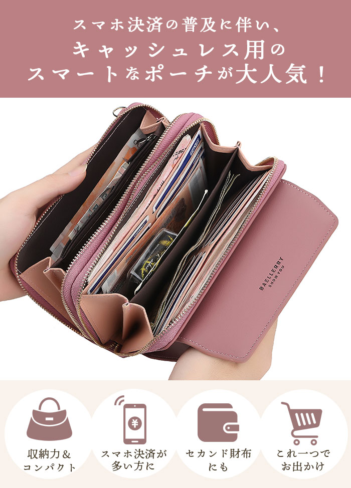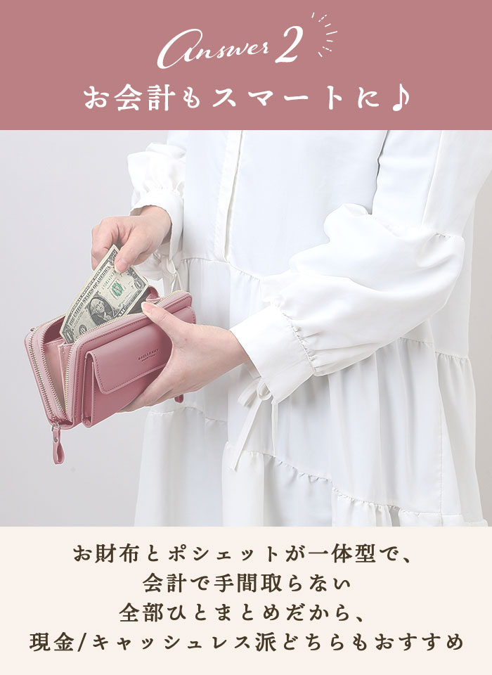 ・ちょっとしたおでかけやランチなど、少ない荷物でお出かけしたい時はこれ1つでOK♪スマホポーチと一体化したお財布ポシェットが新登場。