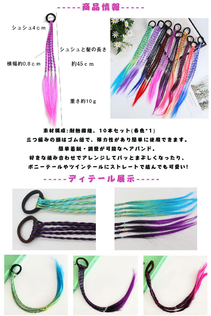 * .素材構成:耐熱繊維、10本セット(各色*1)、長さ:約40cm、幅約3cm、三つ編みの頭はゴム紐で、弾力性があり簡単に使用できます。