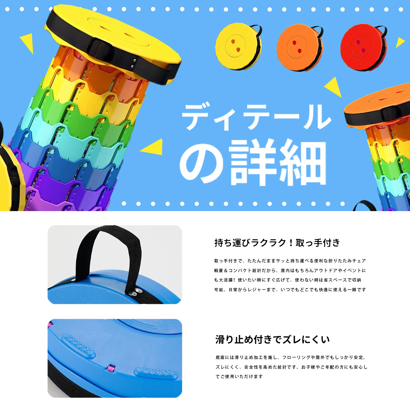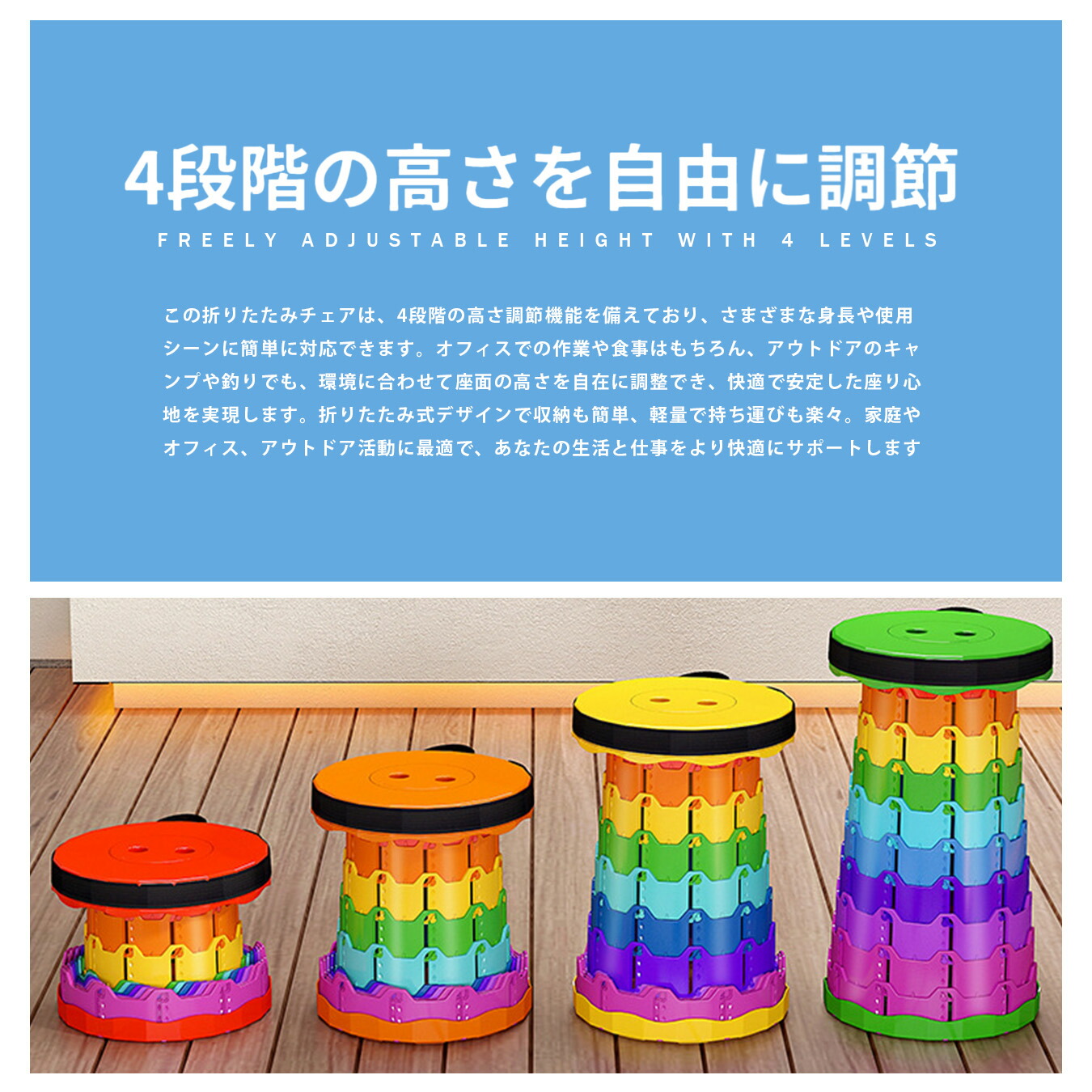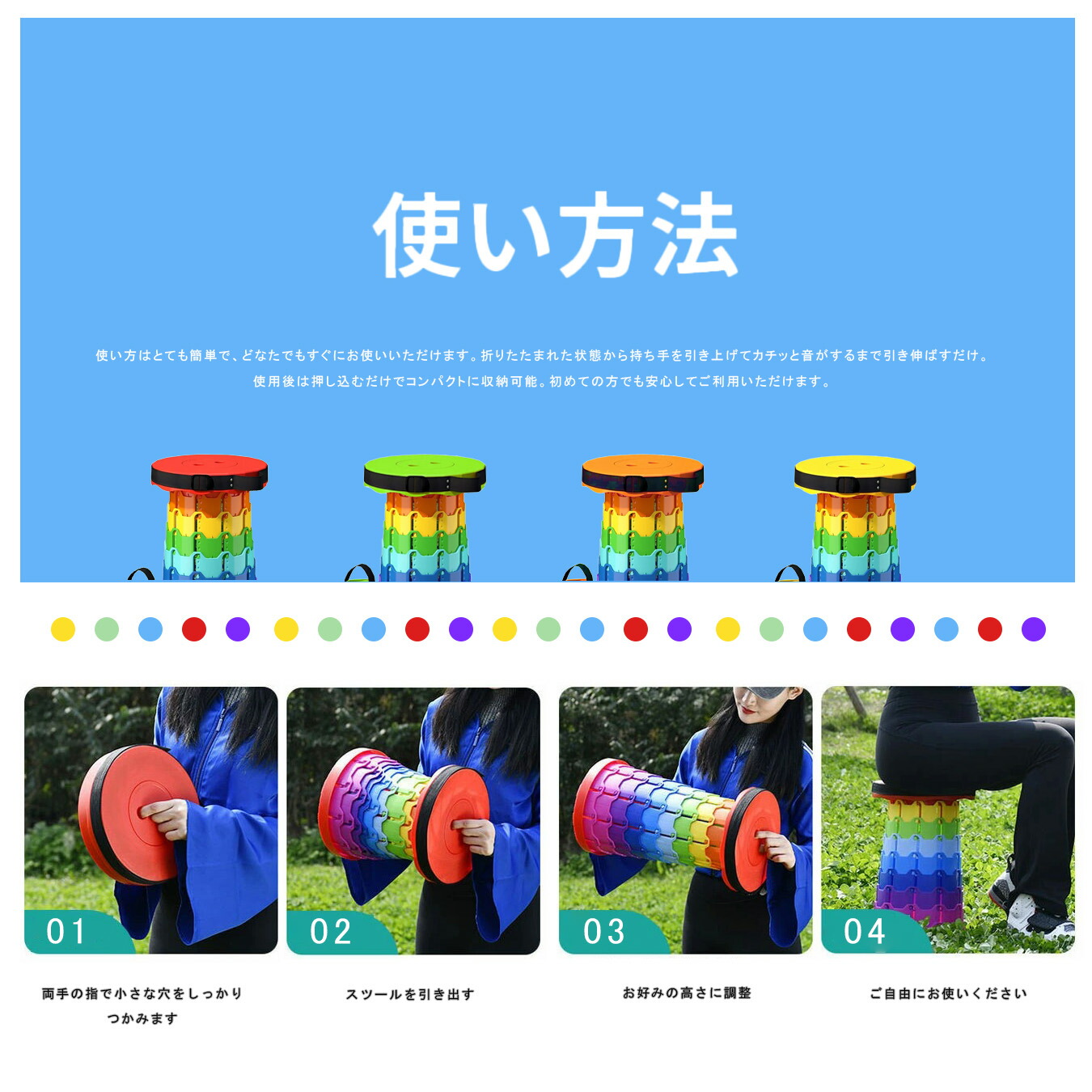 折りたたみ椅子 伸縮スツール 携帯チェア ポータブルチェア アウトドアチェア レジャーイス キャンプ椅子 釣り 椅子 コンパクト収納 軽量スツール 高さ調整 4段階 高さ45cm 直径25cm 収納6cm 肩掛け 手提げ 滑り止め 安定設計 便利グッズ 行列待ち 防災 備蓄 ベランダ ピクニック BBQ フェス 旅行 持ち運びイス 子ども 大人 玄関スツール 作業用チェア キッチンチェア 折り畳みチェア カラフル レインボー ギフト 折りたたみ椅子 携帯椅子 軽量椅子 コンパクト椅子 持ち運び椅子 携帯チェア 折りたたみチェア 折り畳み椅子 ポータブル椅子 ポータブルチェア 折りたたみスツール コンパクトスツール 携帯スツール 軽量スツール 携帯用椅子 小型椅子 ミニ椅子 コンパクトチェア 軽量折り畳み椅子 伸縮椅子 伸縮スツール 伸縮チェア 多機能椅子 耐荷重椅子 折り畳みスツール 携帯伸縮椅子 携帯折り畳み椅子