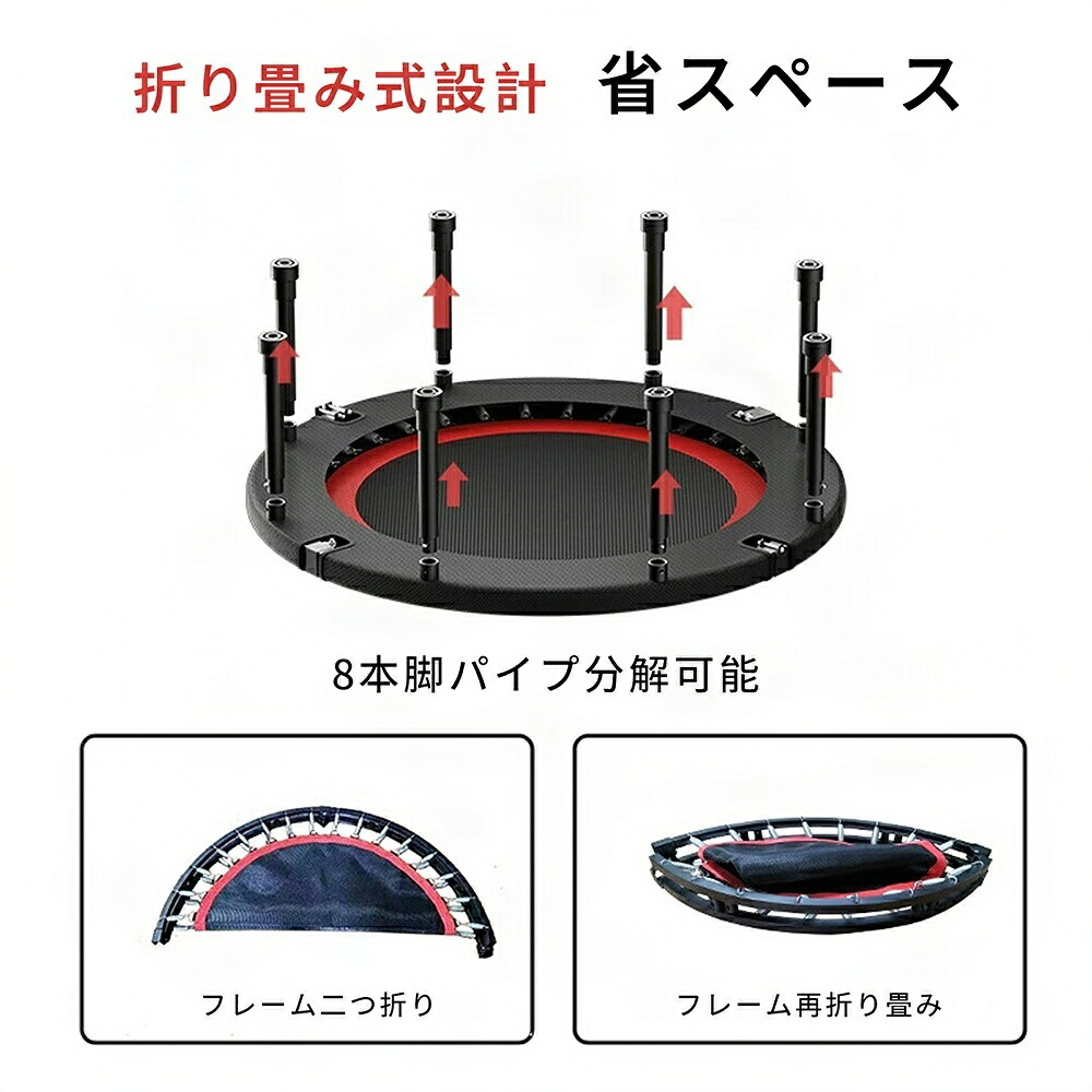 この室内トランポリンは、大人用としても子ども用としても使用可能です。約102cmの広い跳ね面は、楽しさだけでなく、活動力と体力向上にも役立ちます。