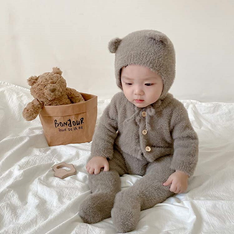 くまちゃん 着ぐるみ 熊耳 ロンパース ベビー ベビー服 ファッション カバーオール ロンパース 特集 キャメル ホワイト グレー ピンク 66 73 80 90 100