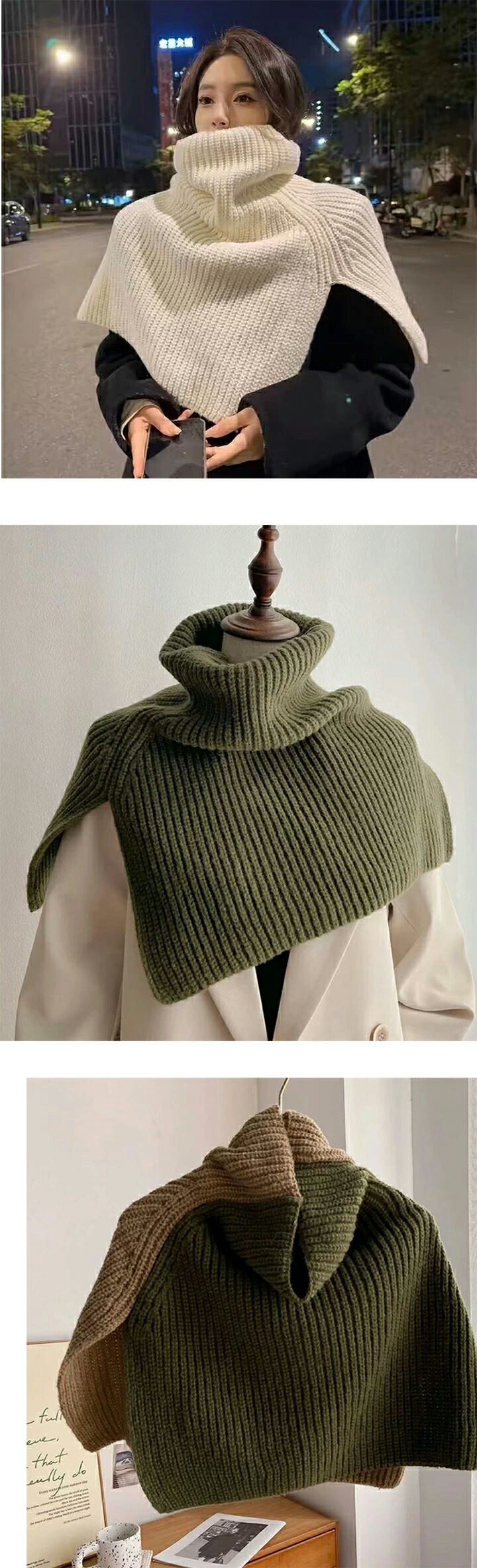 ニットスリットポンチョ3A33 2ター マフラー スカーフ ネックウォーマー スヌード 新登場! Type A(ボタンなし) Type B(ボタンあり) ホワイト アイボリー モカ ブラウン ライトグレー グレー ブラック カーキ ベージュ ベージュxモカ ブラウンxアイボリー グレーxブラック モカxカーキ ブルー×ライトブルー