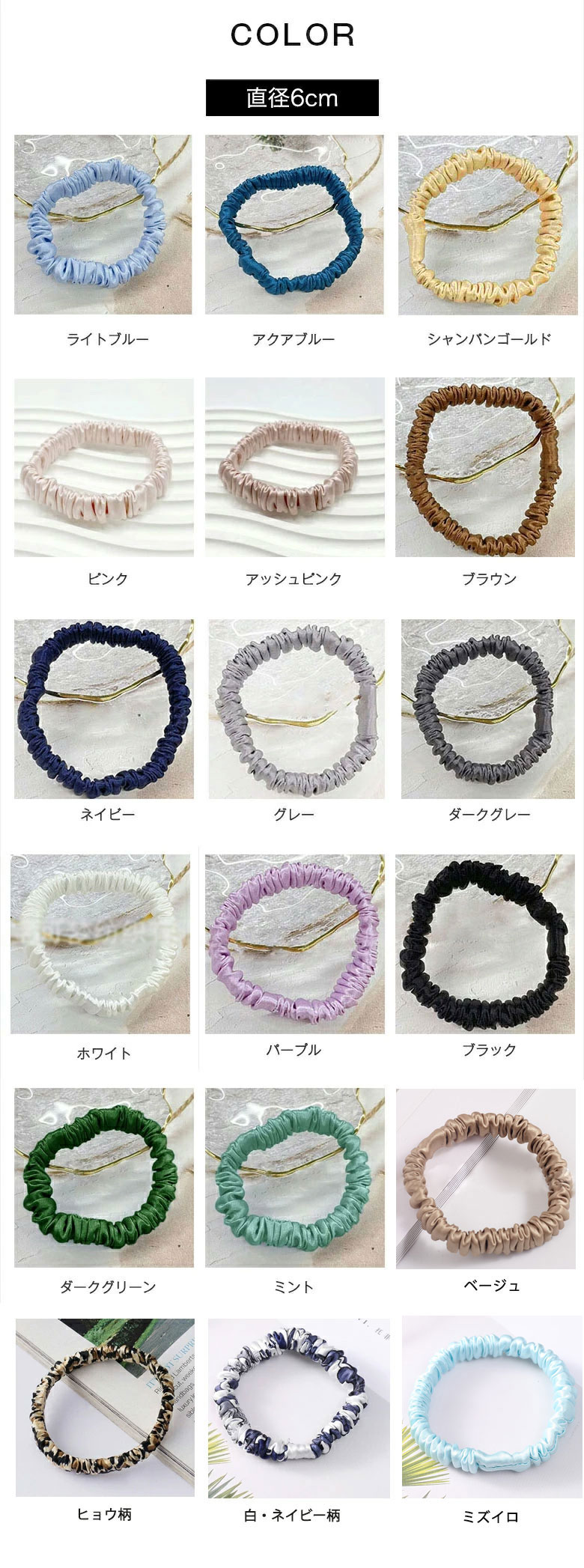シルク ヘアゴム ヘアアクセサリー シ レディースジュエリー アクセサリー ヘアアクセサリー シュシュ 豊富 直径6cm 直径8cm ライトブルー アクアブルー シャンパンゴールド ピンク アッシュピンク ブラウン ネイビー グレー ダークグレー パープル ブラック ダークグリーン ミント ホワイト レッド イエロー ベージュ ミズイロ ヒョウ柄 白・ネイビー柄 アイボリー