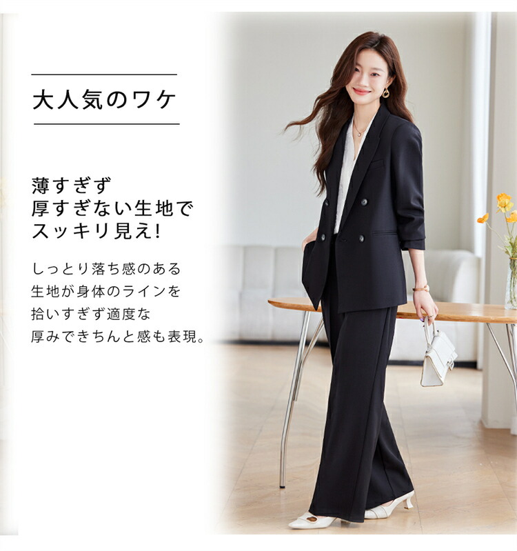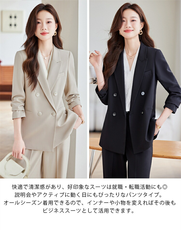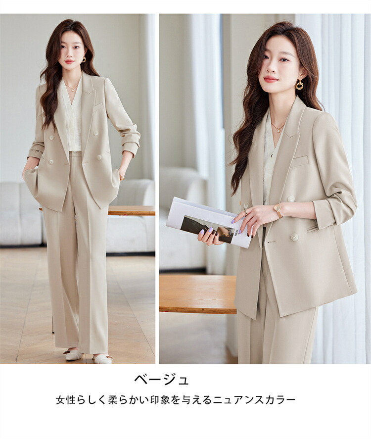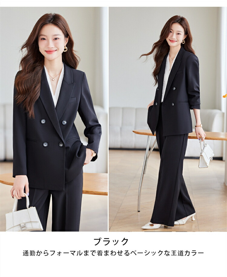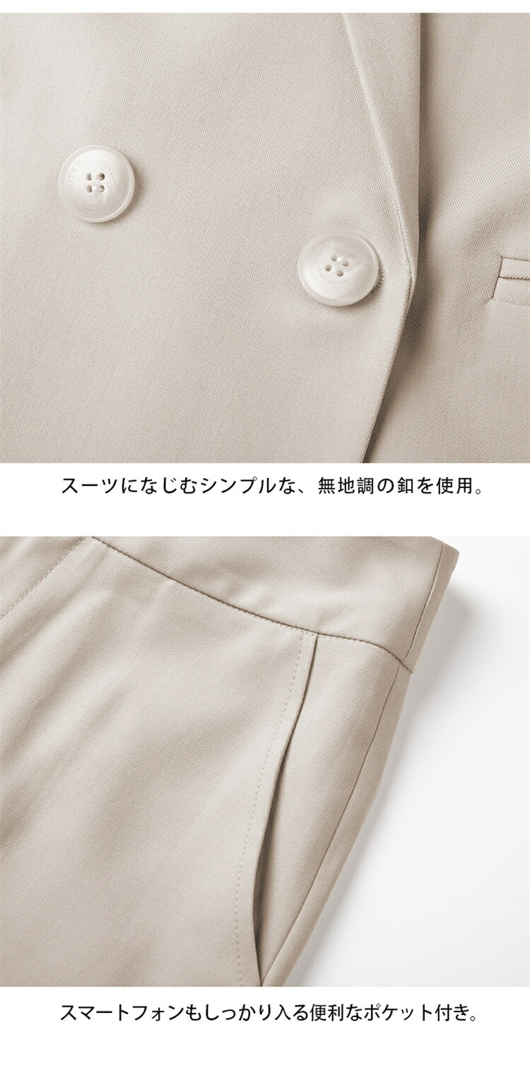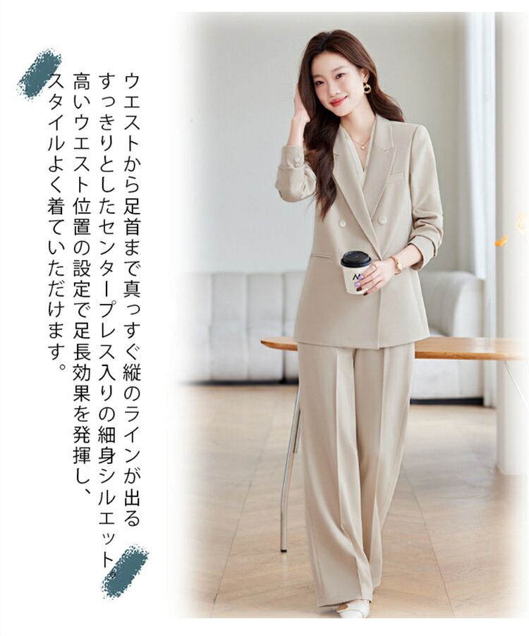 ジャケットのダブルボタンデザインはクラシックでありながら現代的な感覚をプラスし、スタイリッシュなシルエットを演出します。パンツはストレートカットで脚長効果も期待でき、快適な着心地を実現しています。