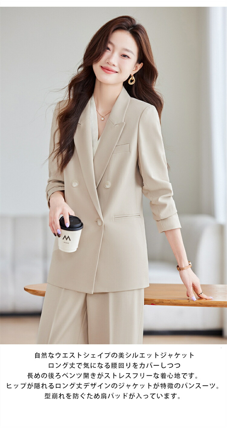 ロングジャケットスーツレディースセットアップは、オールシーズン対応の洗えるパンツスーツで、ビジネスからフォーマルな場まで幅広く活躍します。