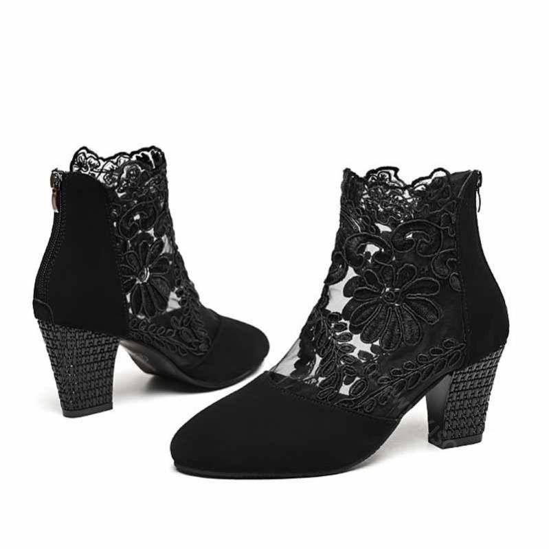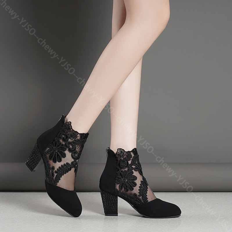サンダルブーツ レディース ブーツ ヒール チャンキーヒール サンダル 花柄 レース メッシュ ファッションサンダル 夏ブーツ 7cmヒール 美脚 アンクルブーティ 夏 疲れない 中敷 オープ 通気性