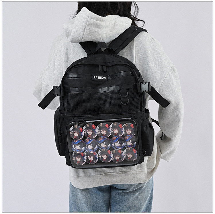 バッグの正面には透明な部分があり、そこにはお気に入りのキャラクターグッズや装飾品を自由に挿入することができます。この機能は、バッグを自分だけのオリジナルなアイテムにカスタマイズすることができ、個性を表現するのに最適です。