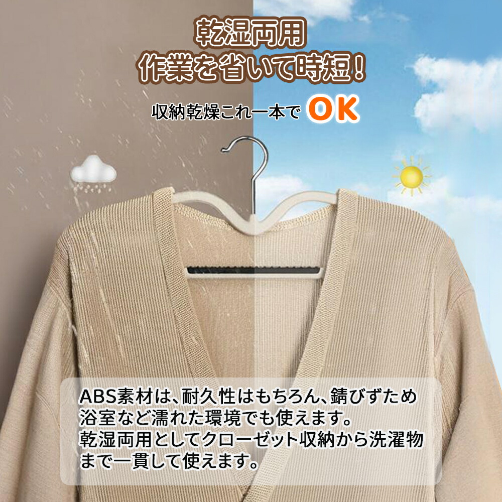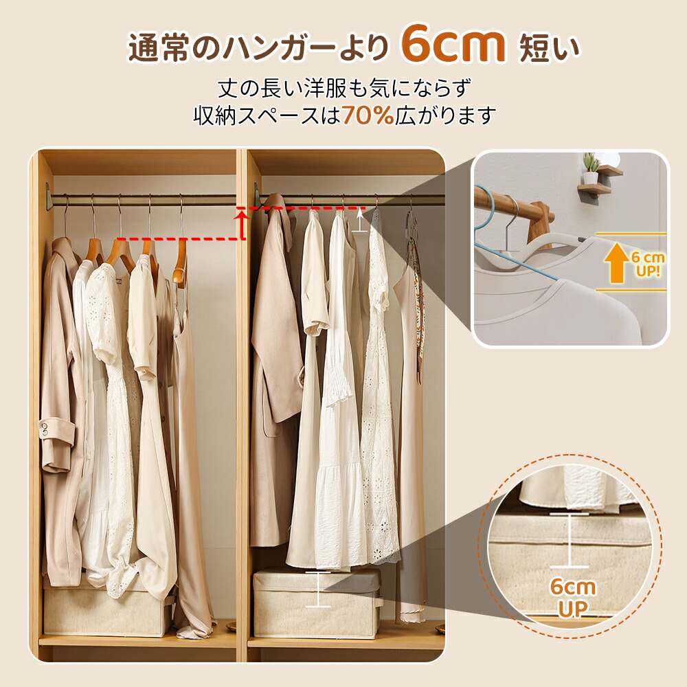 通常のハンガーより6cm短い、丈の長い洋服も気にならず、クローゼットのスペースを最大70%広がります。わずか0.6cmの薄さながら、十分な耐荷重性を兼ね備えています。フック部分は360度回転するので、ストレスなく衣類をかけられるだけでなく、洗濯物を干す際にもメリットがあります。ハンガー自体が極薄なので、クローゼットの中が手狭になる心配もありません。デザインだけでなく機能性も優れた、省スペースで使いやすいハンガーです。頑丈で耐久性に優れた作りながら、スリムなフォルムを実現しました。