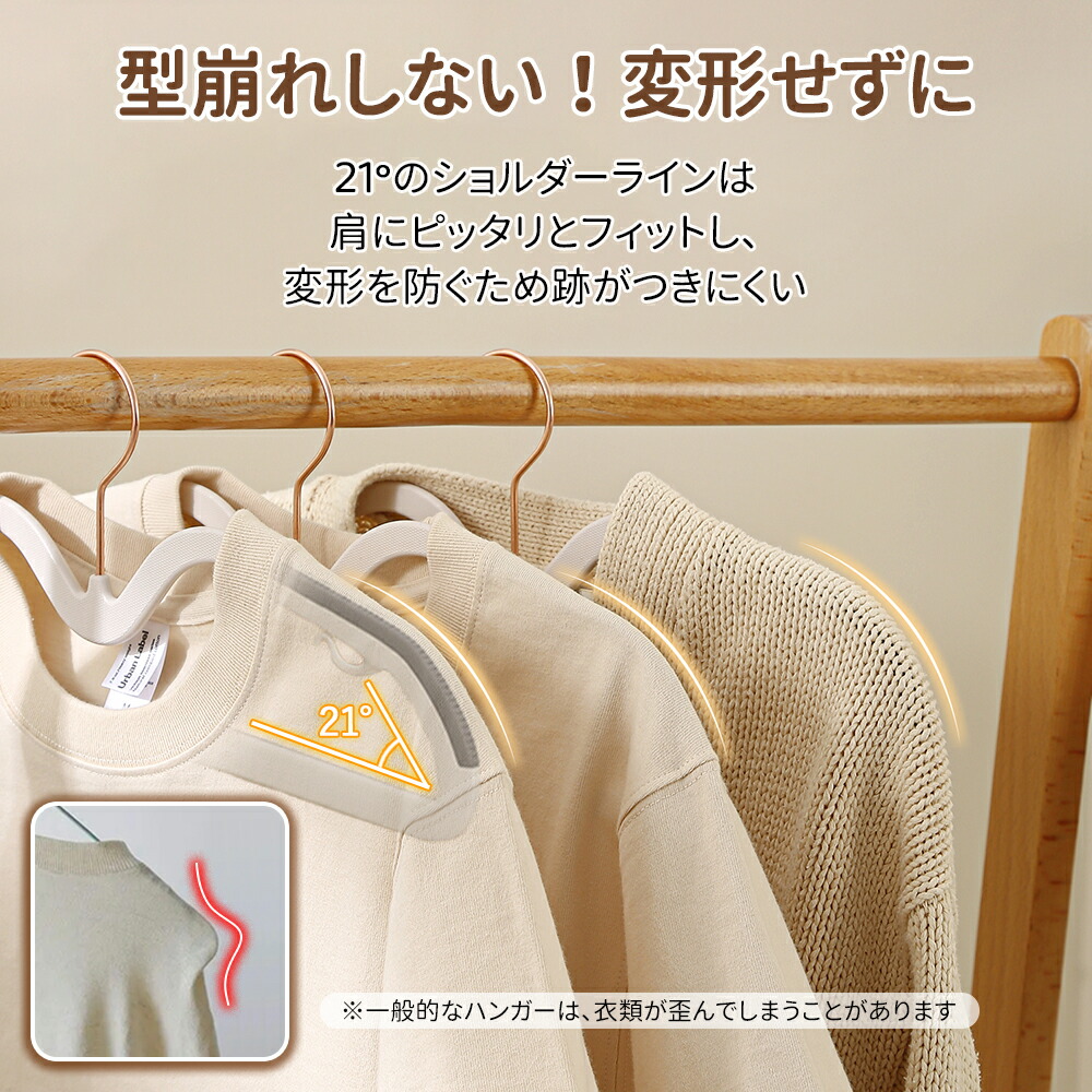 このハンガーは、細部まで行き届いた設計が魅力です。表面に施された特殊な加工により、高い滑り止め効果を発揮します。なめらかな素材の洋服やシルクのようになめらかな生地も、しっかりとキャッチしてくれるので、落下を防いでくれます。更に、ハンガーの肩の部分は人間工学に基づいて設計されており、洋服にハンガーの跡が付きにくいのも特徴です。肩部分が洋服に与える負担を最小限に抑えることで、大切な洋服を型崩れから守ります。