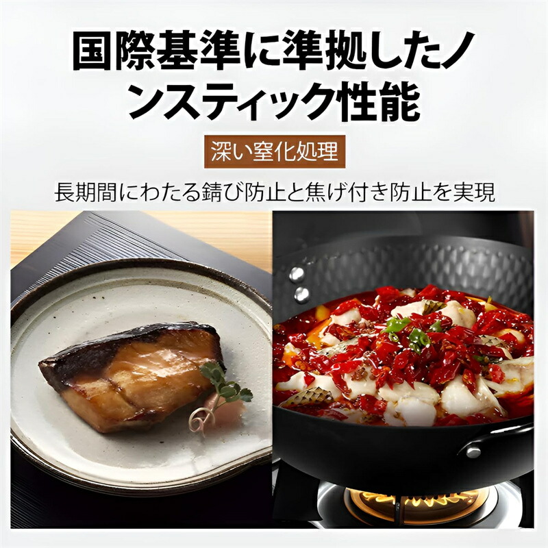 特殊な精製工程とハンマー加工により、鍋表面に自然なノンスティック層を形成。食材の付着を防ぐことで調理後の洗浄が簡単になり、調理効率が向上します。