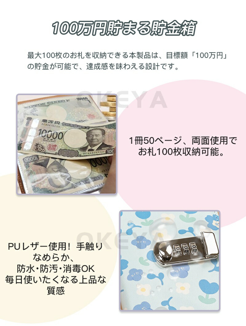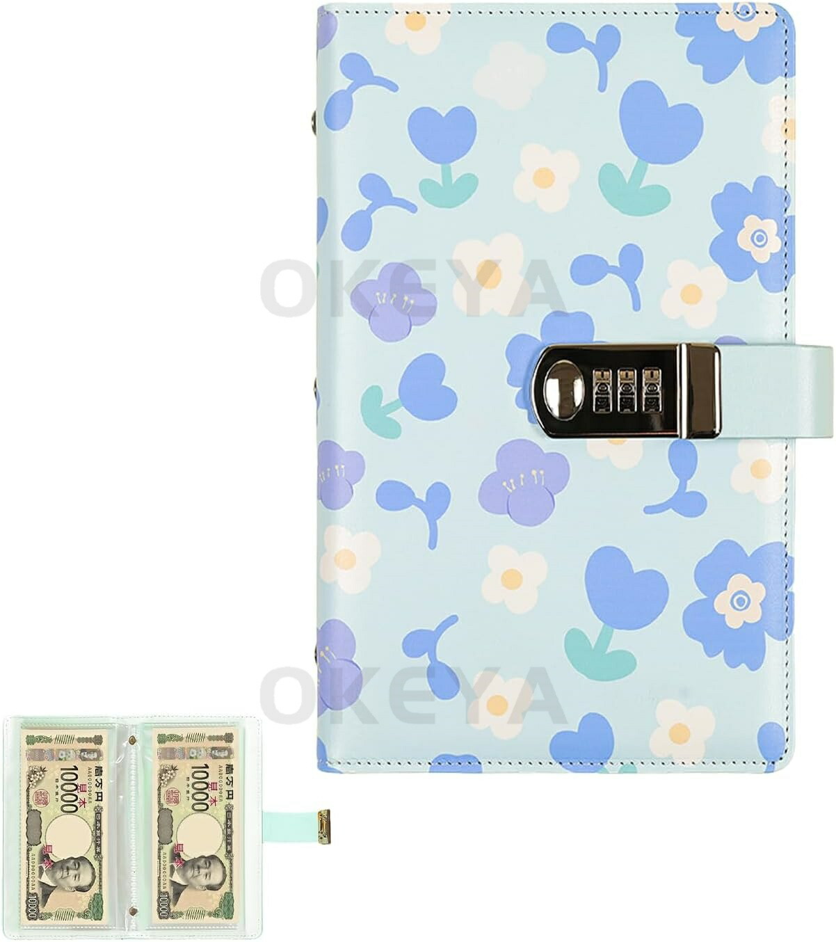 \2点目半額クーポン利用可能 9.11迄/お札貯金ファイル ダイヤルロック付き 100万円貯金目標 最大100枚収納 千円札五千円札対応 折らず保存 6色展開 手帳型バインダー 記念紙 PUレザー防水