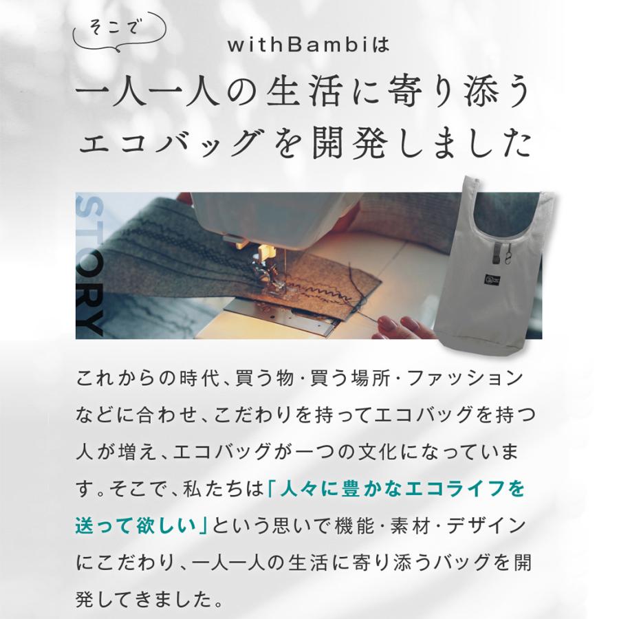 さらに、カラビナ付きで折り畳んだバッグをカバンやベルトループに取り付けられるため、使いたい時にサッと取り出せる利便性もポイント。丈夫な作りで、日々の使用に耐えうる品質を備えています。おしゃれなブラック、グレー、グリーンのカラーバリエーションで、スタイルを選ばずに持てるのも嬉しいポイントです。withbambiのエコバッグで、エコライフをもっと快適に、もっとスタイリッシュに。