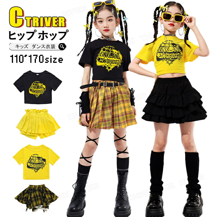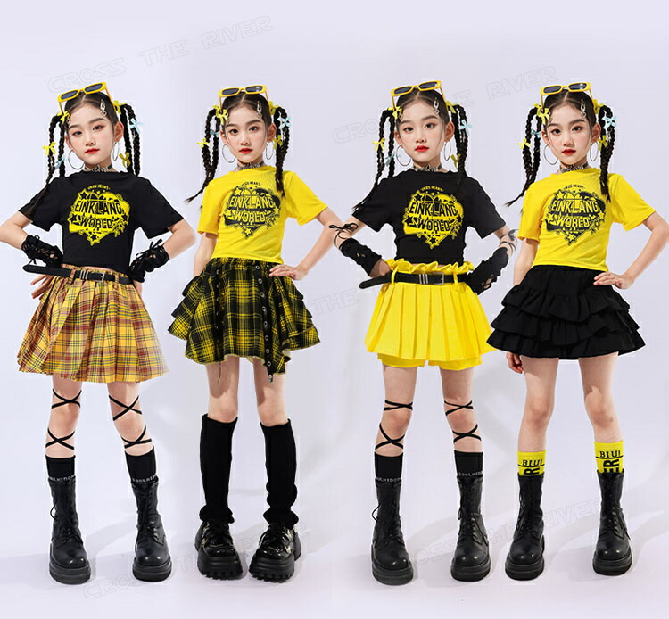 キッズ チアダンス衣装 セットアップ スポーツ アウトドア 通販 黒トップス 黄色トップス 黄色キュロット 黒スカート チェック柄スカート1 チェック柄スカート2 セットA セットB セットC セットD 110cm 120cm 130cm 140cm 150cm 160cm 170cm