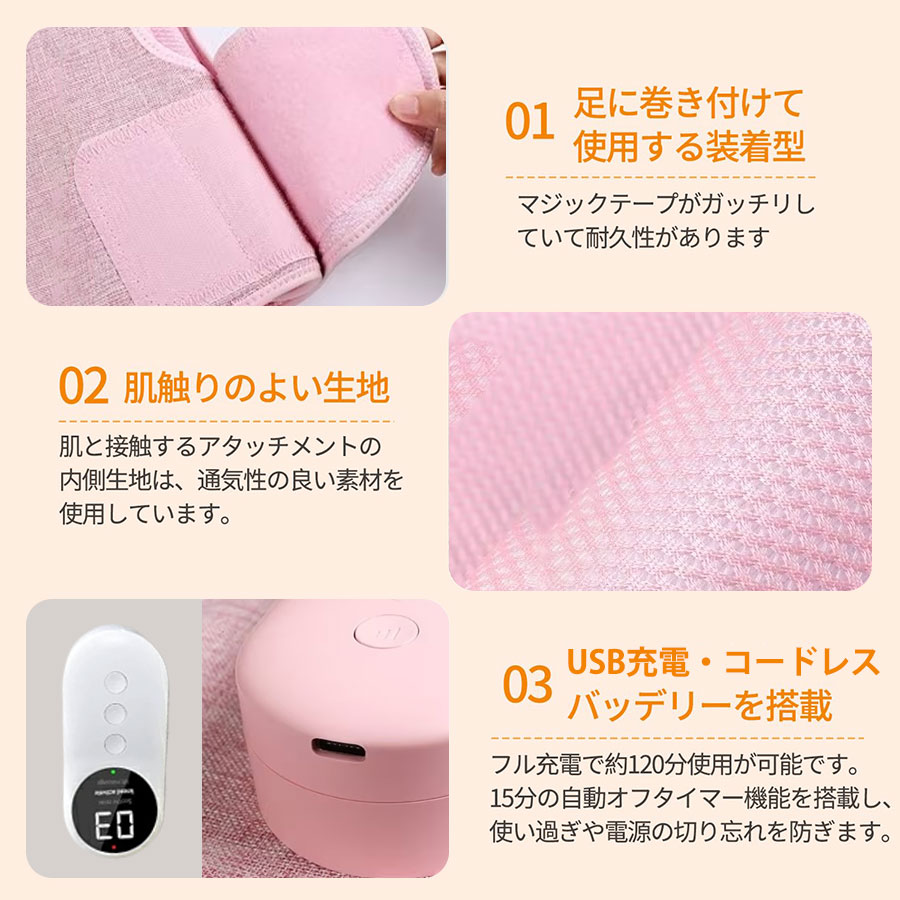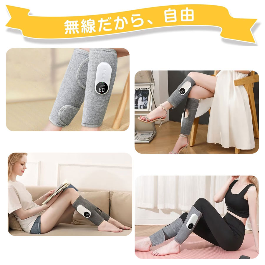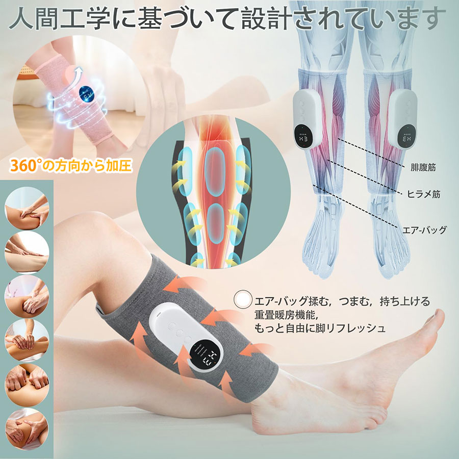 内蔵された4つのエアバッグが、ふくらはぎを下から絞り上げ、しっかりリラックスします。3種類のエアバッグモードが選択可能です。このふくらはぎリラックスはコードレス充電式です、エアー圧縮の方式で足とふくらはぎの筋肉を下から上に押して、様々な人のリラックスニーズに満足できます。