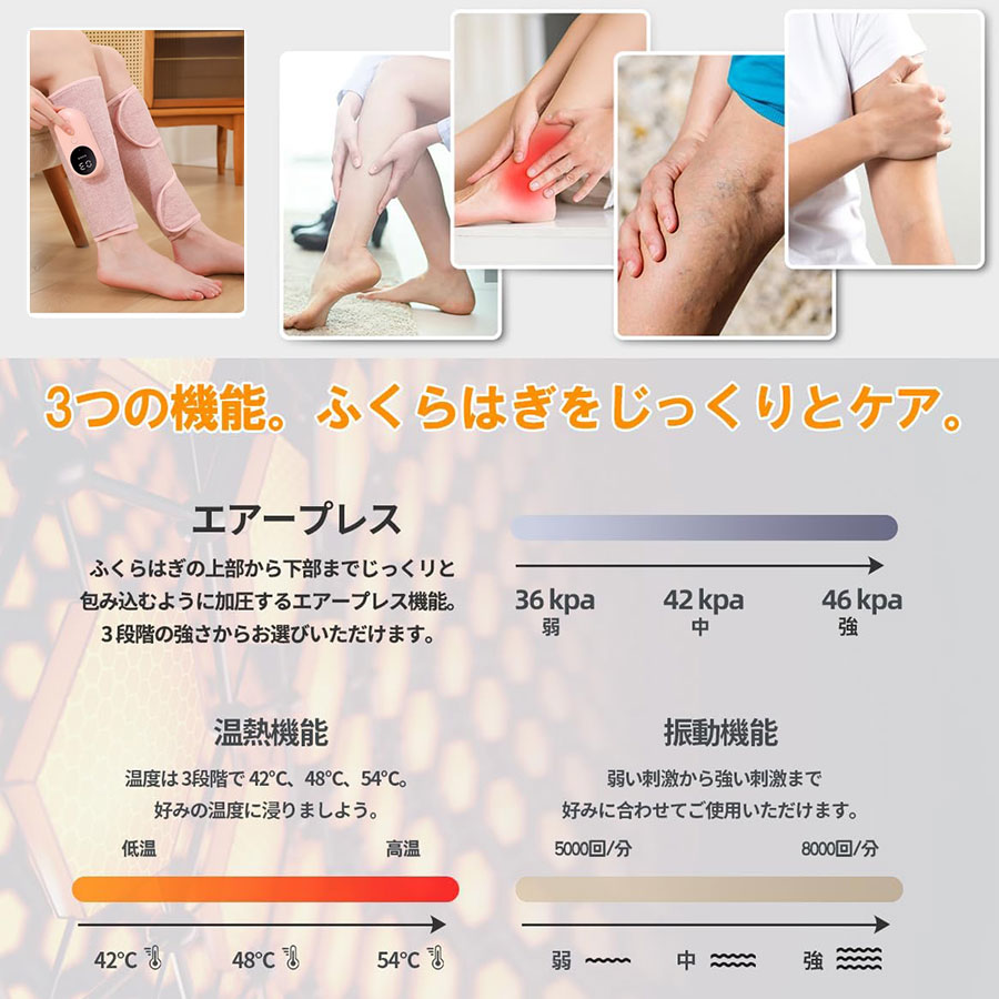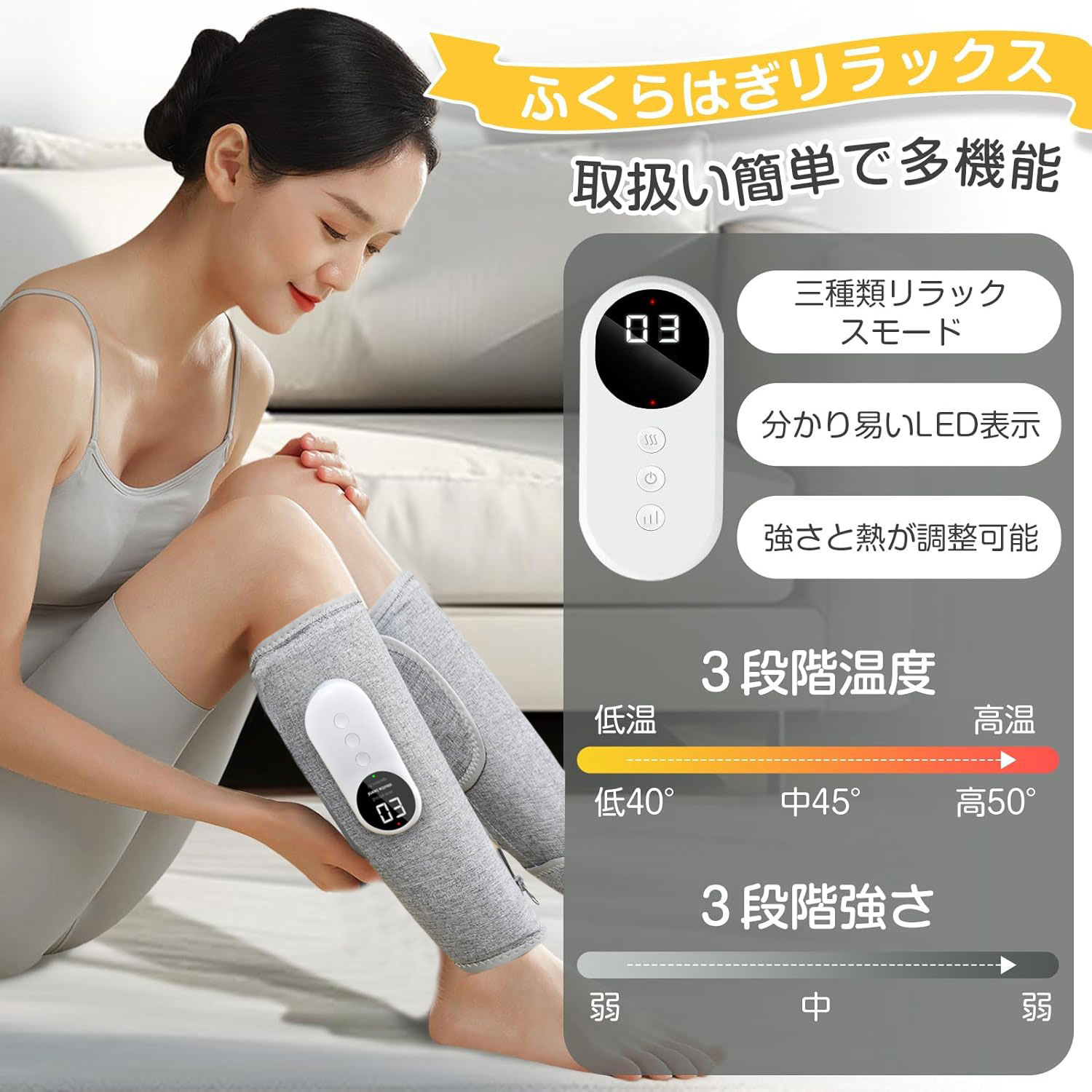ふくらはぎケア リラックス レッグエアマッサージ器 太もも 足ケア 空気圧 温熱 コードレスUSB充電式 3モード 3段階強度 3段階温度 サイズ調節可 操作簡単 男女兼用 誕生日 敬老日 コンパクト