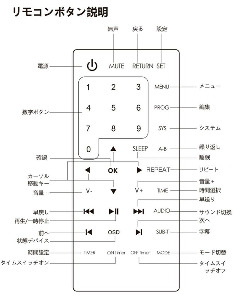 パッケージ内容:1.プレーヤー本体 ×1 、2.デスクスタンド×1、 3.HDMI ケーブル×1 、4.AVケーブル×1、 5.ワイヤレスリモコン ×1、 6.日本語取扱説明書 ×1