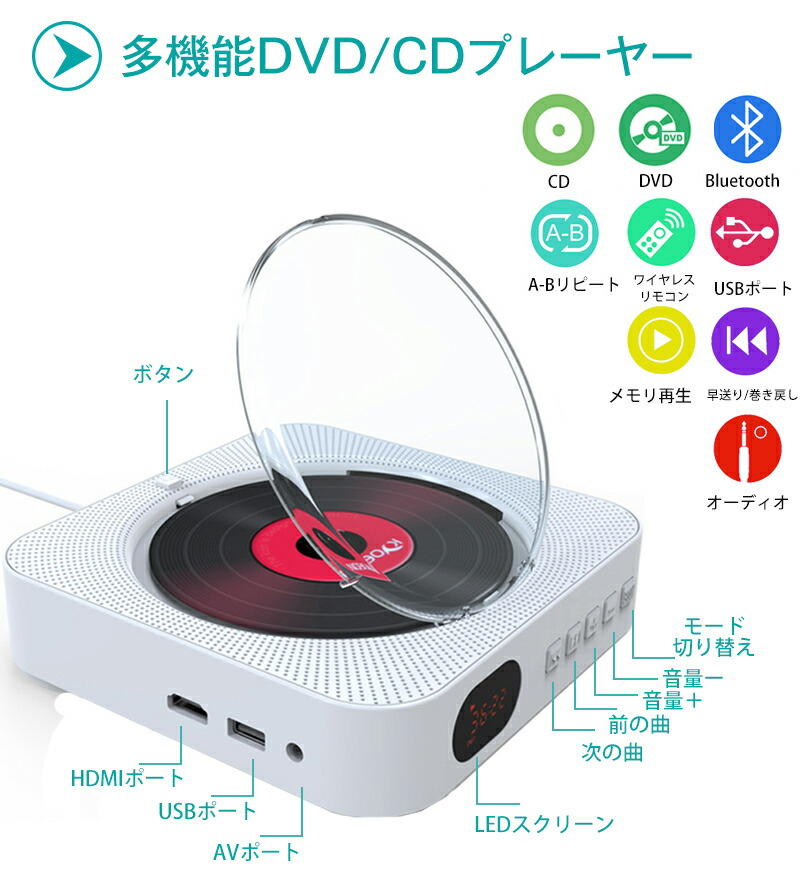 CD プレーヤー 壁掛け DVDプレーヤー コンパクト リモコン付き ポータブル HDMI 1080p 出力テレビ プレイヤー Bluetooth 置き掛け兼用 防塵カバー 日本語説明書 壁掛