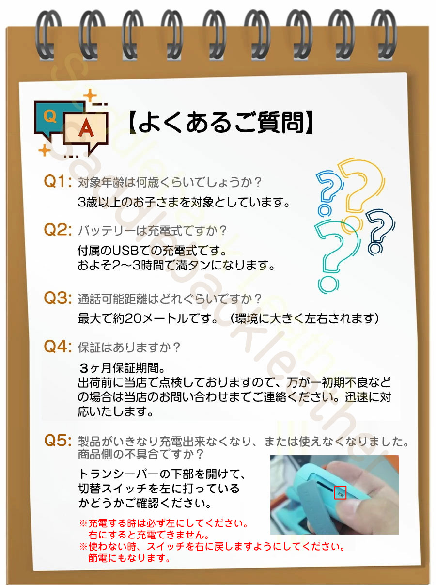 商品内容:トランシーバー本体、USB充電ケーブル、日本語説明書、トランプ(ロットによりデザインが変わります)