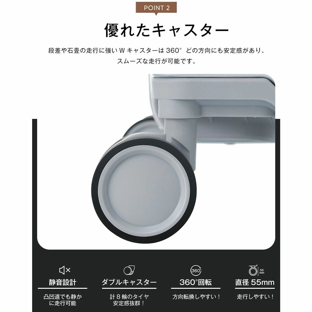 POINT 2.【優れたキャスター】段差や石畳の走行に強いWキャスターは360°どの方向にも安定感があり、スムーズな走行が可能です。 a.静音設計 凸凹道でも静かに走行可能