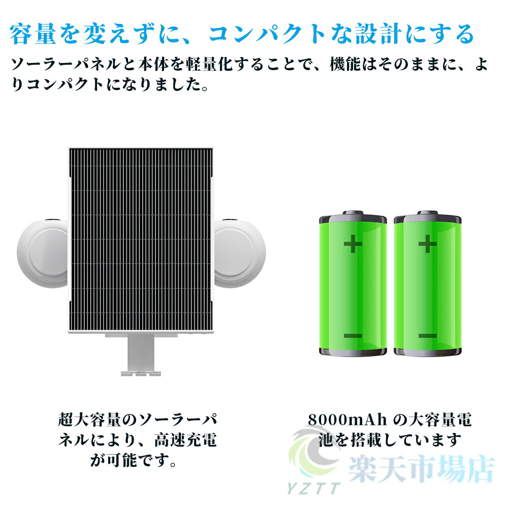 このワイヤレス屋外防犯カメラは単結晶ソーラーパネルを搭載し、光電変換効率は 19.5% に達し、ワイヤレスカメラに持続的に電力を供給し、365 日年中無休で稼働することが可能です。デバイスには 8000mAh の大容量バッテリーが内蔵されているため、電源接続は不要で、設置時の配線の手間を省け、玄関、カーポート、庭など電源から離れた場所でも便利に使用できます。