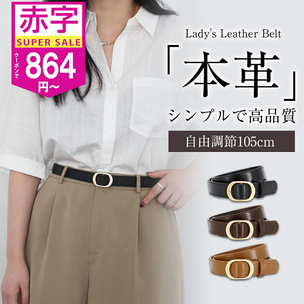 ベルト レディース 本革 おしゃれ ワンピース用 穴なし バックル 真鍮 細 105cm 細身 細め 調整可能 革 かわいい 細い 黒 ジーンズ 太 ブランド ビジネス 学生 中学生 高校 社会人