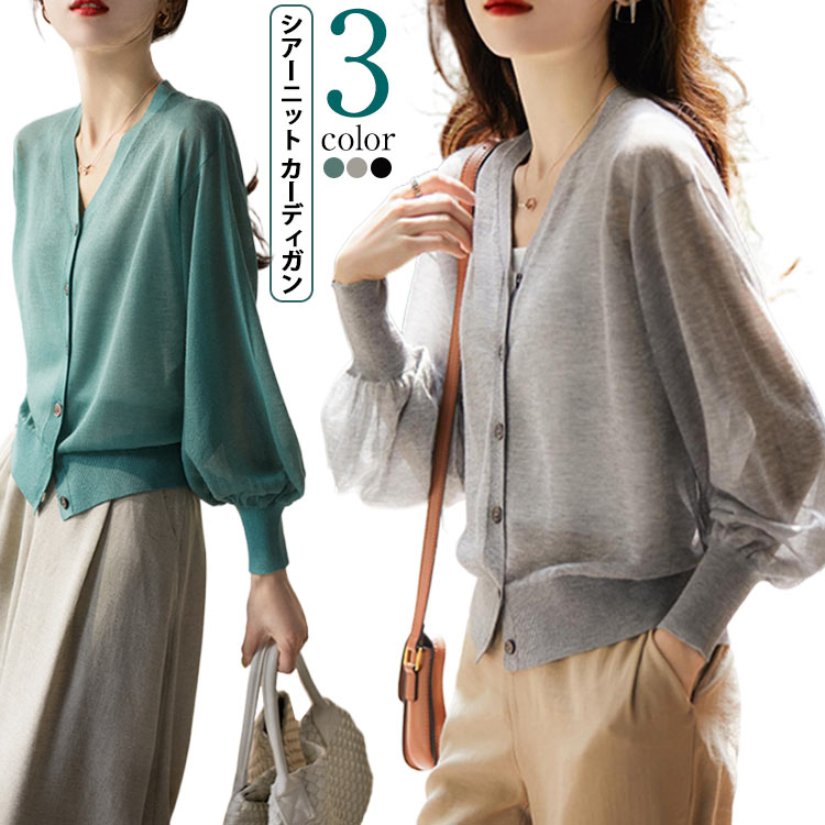UVカット シアーニット Vネック レディース トップス 羽織 透け感 夏 通勤 オフィス パフスリーブ カジュアル 無地 長袖 薄手 春夏秋 黒 UVケア 冷房対策 涼しい ナチュラル