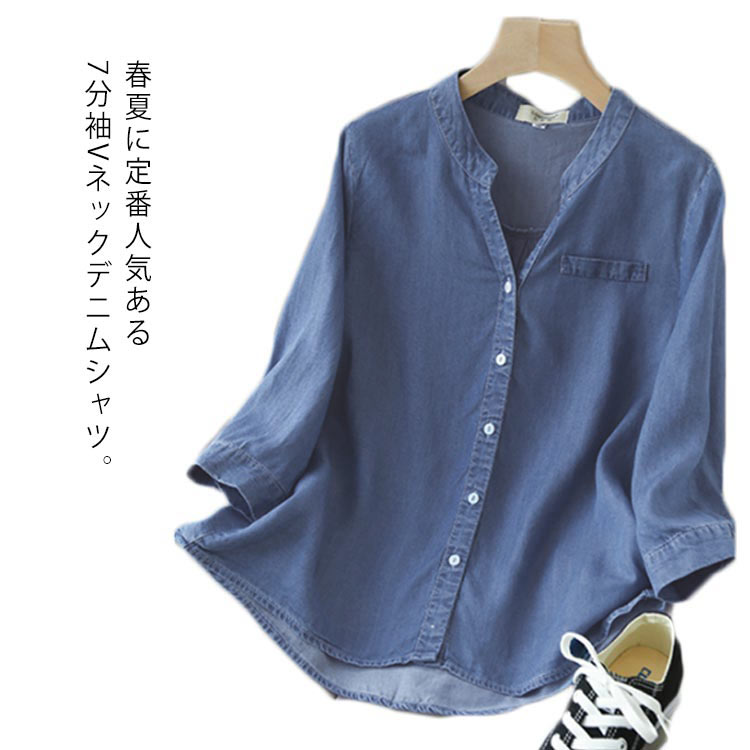 デニムシャツ レディース デニムブラウス 七分袖 七分袖シャツ vネック トップス ダンガリーシャツ デニムダンガリー シャツ ブラウス 春夏 夏 お洒落 薄手
