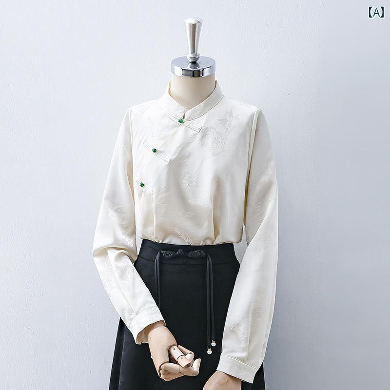 レディース トップス ブラウス 通勤 オフィス 普段使い チャイナ風 長袖 シャツ エレガント 春 シンプル ファッション スタンドカラー シック ジャカード