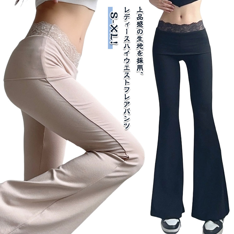 レディース フレアパンツ ストレッチ スリムパンツ ハイウエス 春 秋 パッチワークレース ボトムス ブーツカットパンツ ロングパンツ 美脚ライン 体型カバー カジュアル レース ヨガパンツ キレイめ