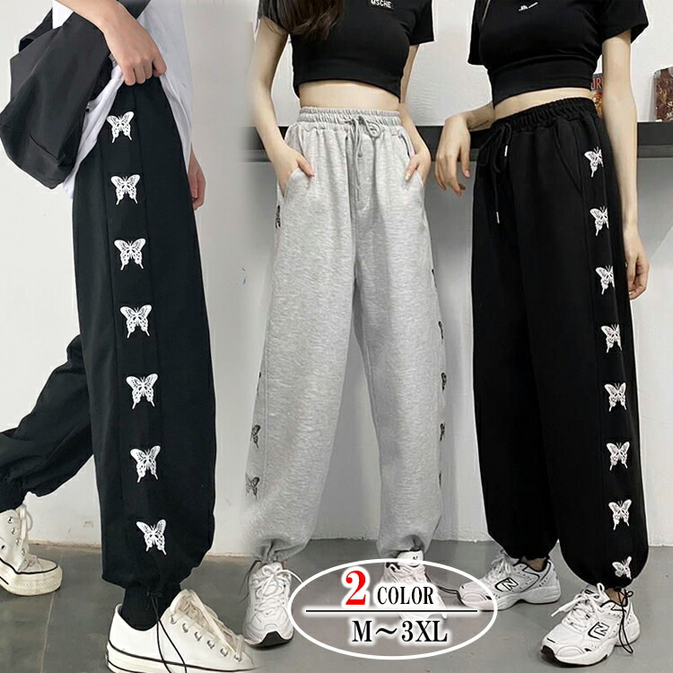 サイドバタフライラインパンツ ボトムス 蝶 ジョガーパンツ トラックパンツ スウェットパンツ グレー ブラック ダンス 練習着 大きいサイズ ウエスト ゴム 部屋着 長ズボン ロングパンツ レディース