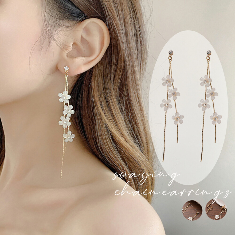 揺れる チェーンピアス 花びらイヤリング フラワーモチーフ ノンホール おしゃれイヤリング 痛くないロングピアス ぶら下がり プチプラジュエリー 2OUE 韓国アクセサリー