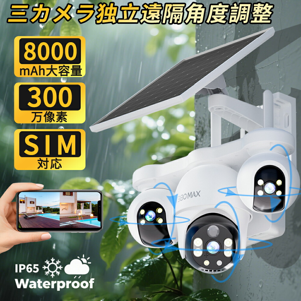 【三レンズ防犯カメラ★太陽光パネル充電】防犯カメラ ソーラー 電源不要 動体検知 自動追跡 見守りカメラ 声光威嚇 カード/クラウド保存 1年保証 無線 屋外 夜間カラー撮影