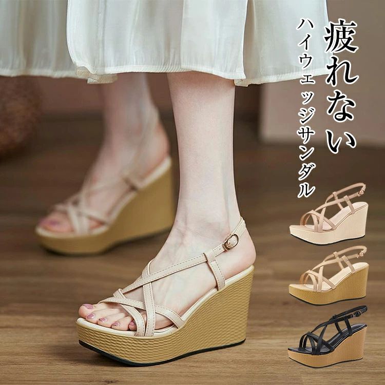 ウェッジソール サンダル レディース 太ヒール ローヒール 厚底ヒールサンダル 痛くない 歩きやすい 走れる ラウンドトゥ アンクルストラップ クロスベルト 大人可愛い かわいい シ ヒール8.5cm