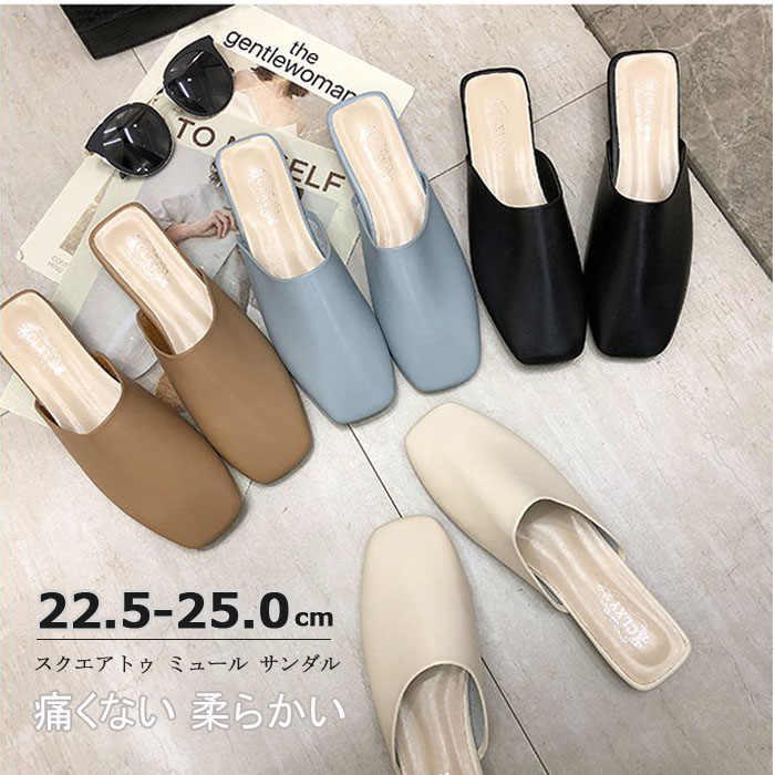 スクエアトゥ ミュール サンダル ぺたんこ レディース フラット 痛くない柔らかい ブラック 春夏秋冬 黒 スリッパ 低反発 22.5 23.0 23.5 24.0 25.0cm 大さい 小 24.5