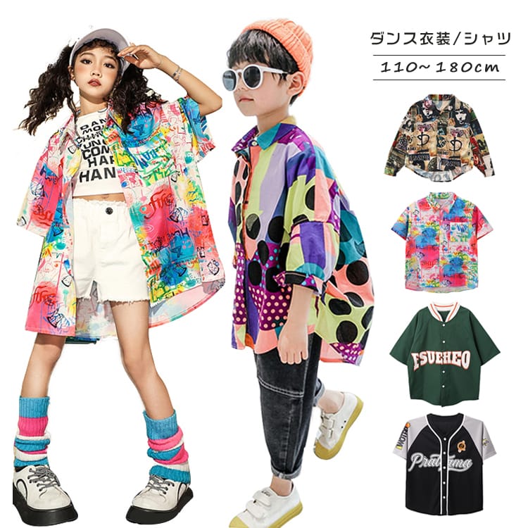 柄シャツ キッズ ダンス 衣装 ゆるシャツ カラフル 子供服 k-pop ベースボールシャツ カジュアルシャツ 練習着 キッズダンス衣装 シャツ 男の子 キッズダンス ヒップホップ 子 女の子