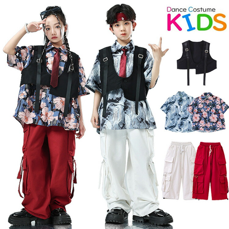 花柄 シャツ キッズ ダンス衣装 子供服 女の子 男の子 HIPHOP セットアップ ストリート ダンスウェア ヒップホップ 半袖 トップス パンツ ベスト かっこいい おしゃれ 練習着 チアガール