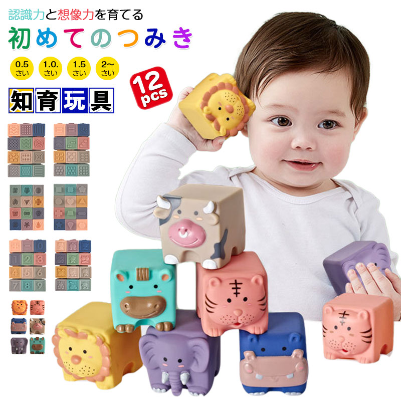 数字、動物、果物の図案があって子供が振ったり、積んだり、転がしたりした途中で楽しく遊びながら想像力、創造力、集中力など身につけ、赤ちゃんの認知学習にも役たつ