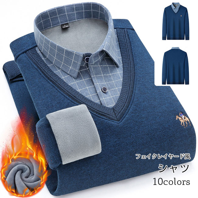 シャツ メンズ フェイクレイヤード ニットセーター ブラウス 秋冬 裏起毛 裏ボア Vネック チェック柄 綿混紡 トップス プルオーバー リブ 重ね着 長袖 お洒落 保温 新作 カジュアル