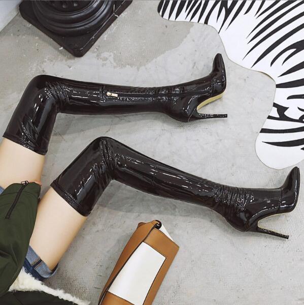 ブーツ レディース ニーハイブーツ エナメル ロングブーツ ストレッチソックスブーツ サイハイブーツ 7.5 10 11.5センチ ハイヒール スーパーロングブーツ ロング丈 大きいサイズ キレイめ
