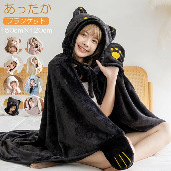 ブランケット マント 着る毛布 モコモコ ふわふわ ボア 大判 おしゃれ ひざ掛け 兎耳 ネコ 黒猫 クマ ポンチョ ロング かわいい もこもこ フード付き あったか ルームウェア