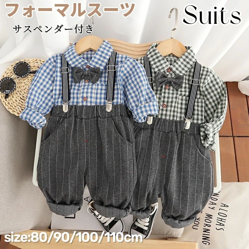ビー スーツ 男の子 長袖シャツ チェック柄 サロペット サスペンダー パンツ 長ズボン 蝶ネクタイ付き フォーマル セットアップ キッズ 入園式 ベビー服 綿 子供服 幼児 紳士服 子 男児