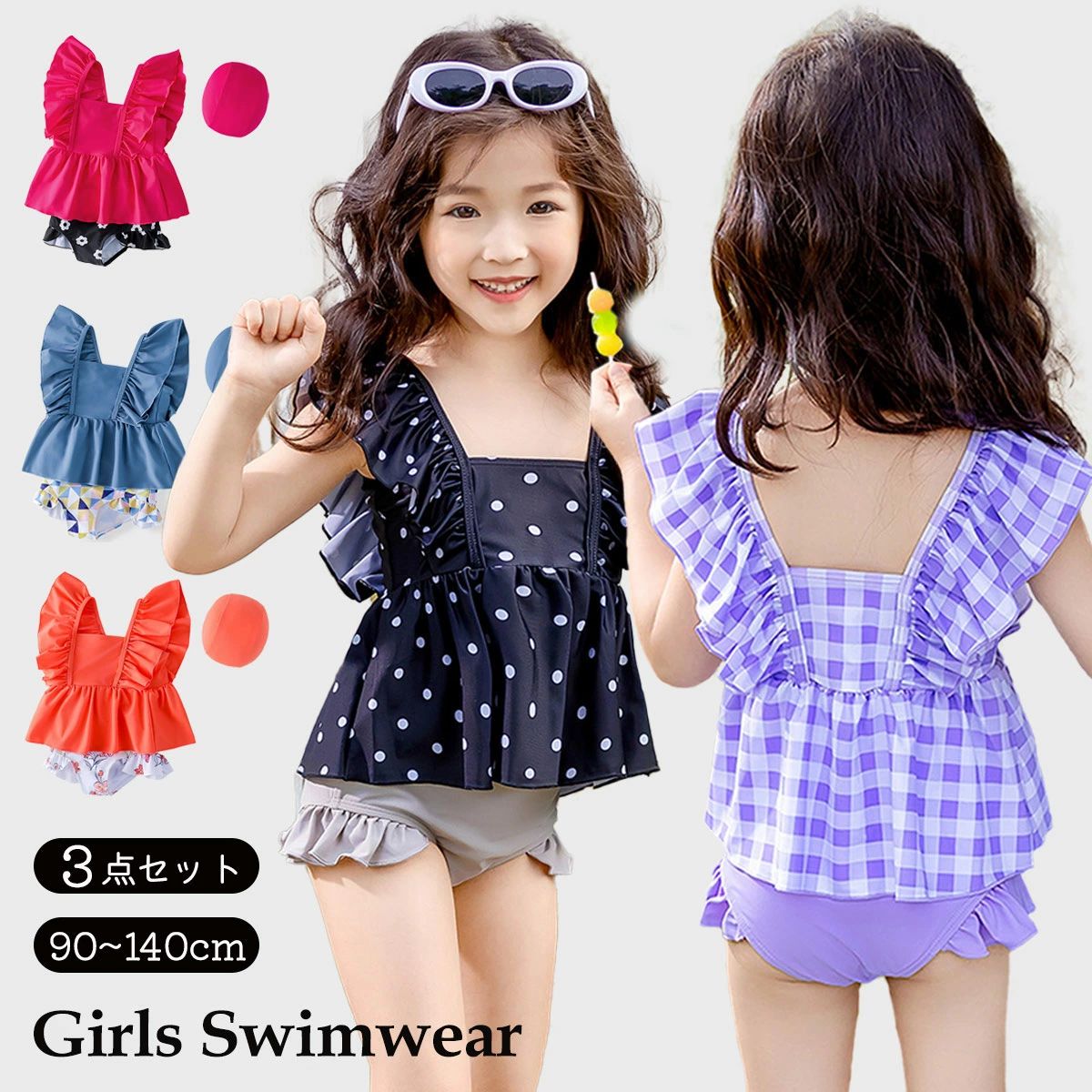 女の子 水着 セパレート 3点セット キャップ付き UVカット フリル かわいい タンクトップ ショーツ スイムキャップ 速乾 スイムウエア キッズ 上下セット みずぎ 子ども 保育園 子供